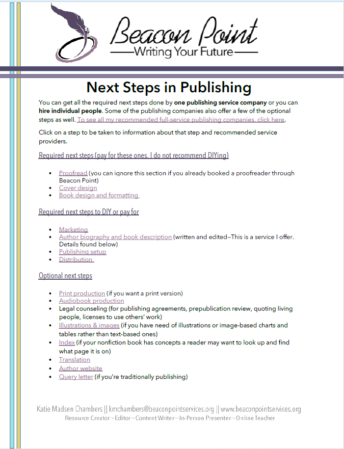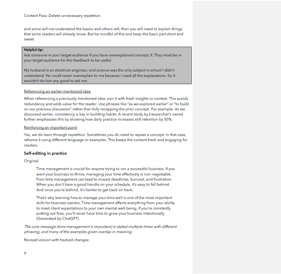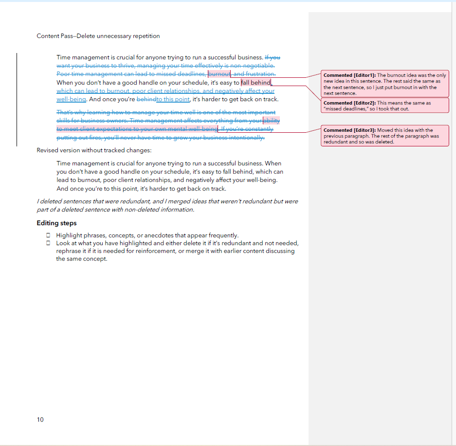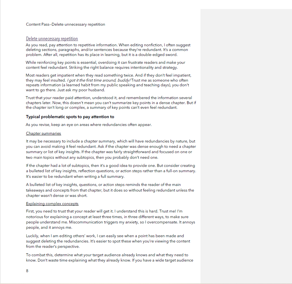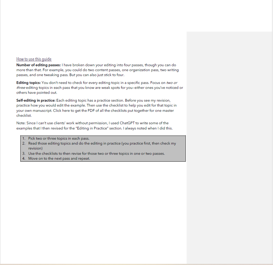 Katie’s self-editing guide gives you a specific process for organizing your content, leading with engagement, making every page count to your reader, and using your unique experience to differentiate you from everyone else who has written on the topic. This guide will make you a better writer. And, if you follow it, it will make your editor like you better.