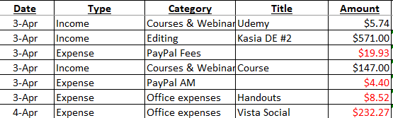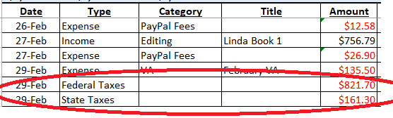 If this matters to you like it does me, you will want to record a monthly tax payment even if you pay taxes quarterly (see more about taxes in my upcoming blog Taxes for US Editors).