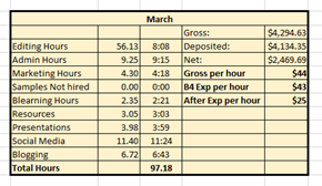 Each month, I enter in my monthly gross and net, then my time spent on billable and nonbillables. This then displays what I grossed per hour and what I netted after expenses per hour for that month. It also shows the year to date totals.