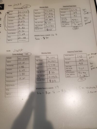 I view this amount as more like a cap, meaning I don’t want to spend more time than what I have listed, and if I do, I need to revisit my processes and policies and see what I can streamline. For example, if I were to go over my allotted time for my sample edits not hired category, I would reassess my decision not to charge for them, but so far, I haven’t gone over.